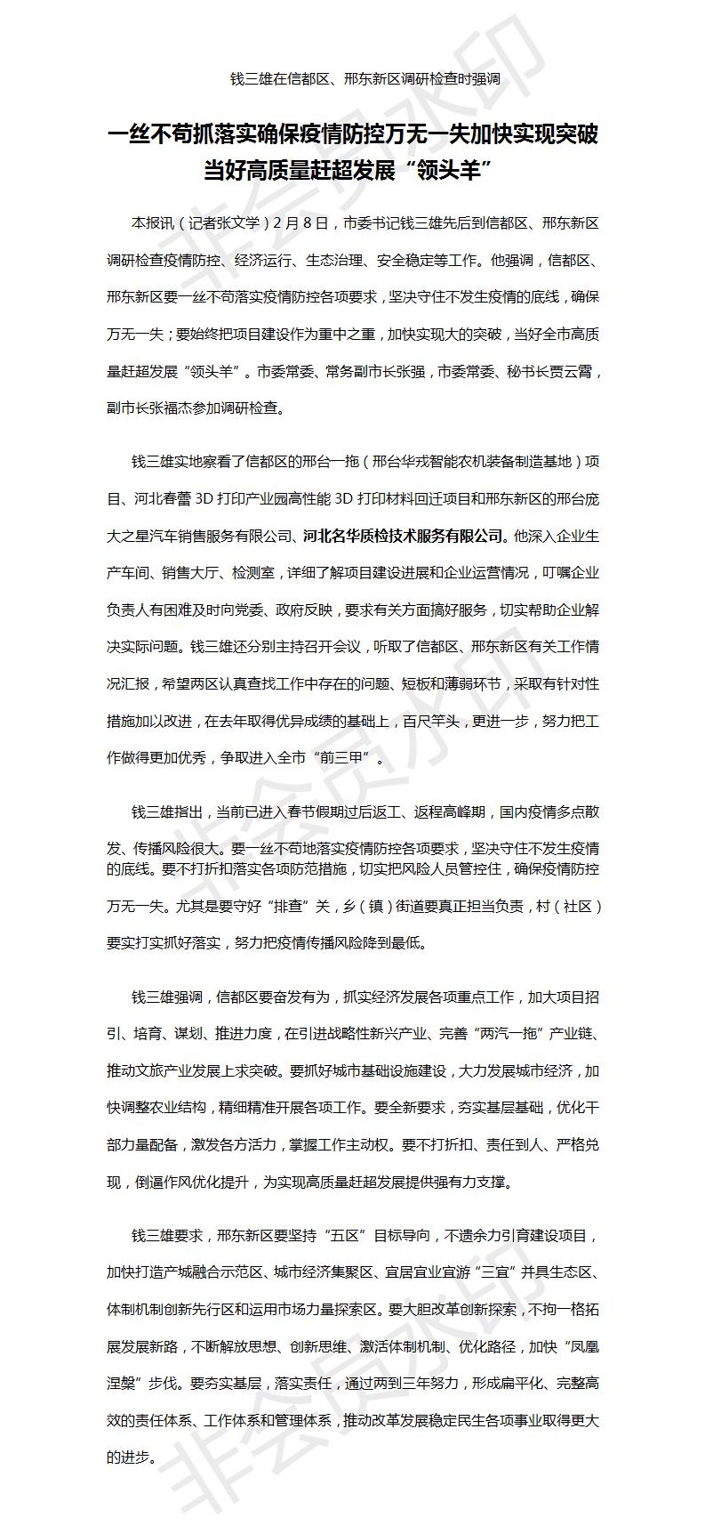市委书记钱三雄到河北名华质检技术服务有限公司调研检查